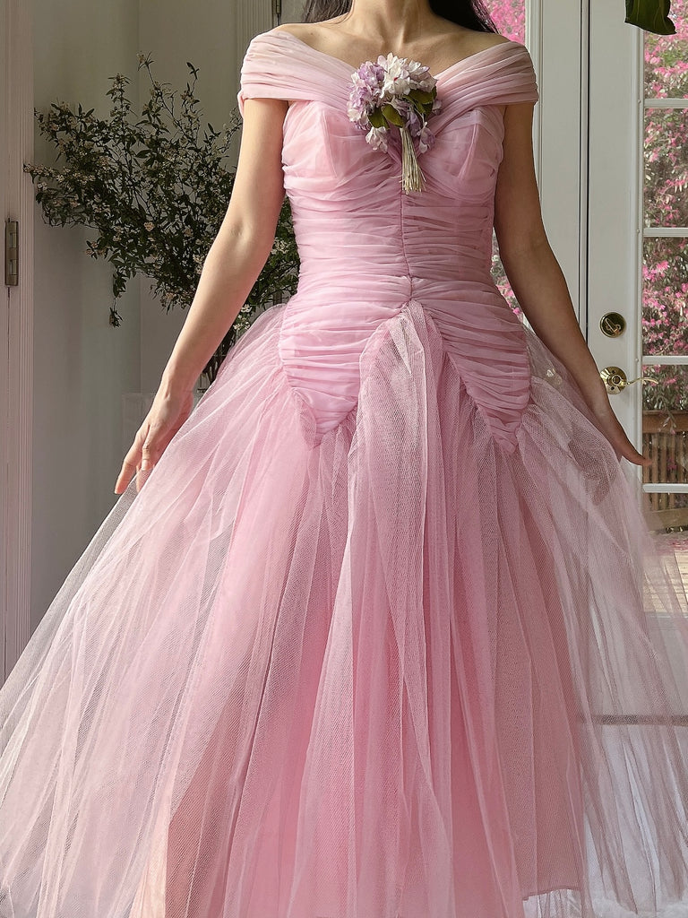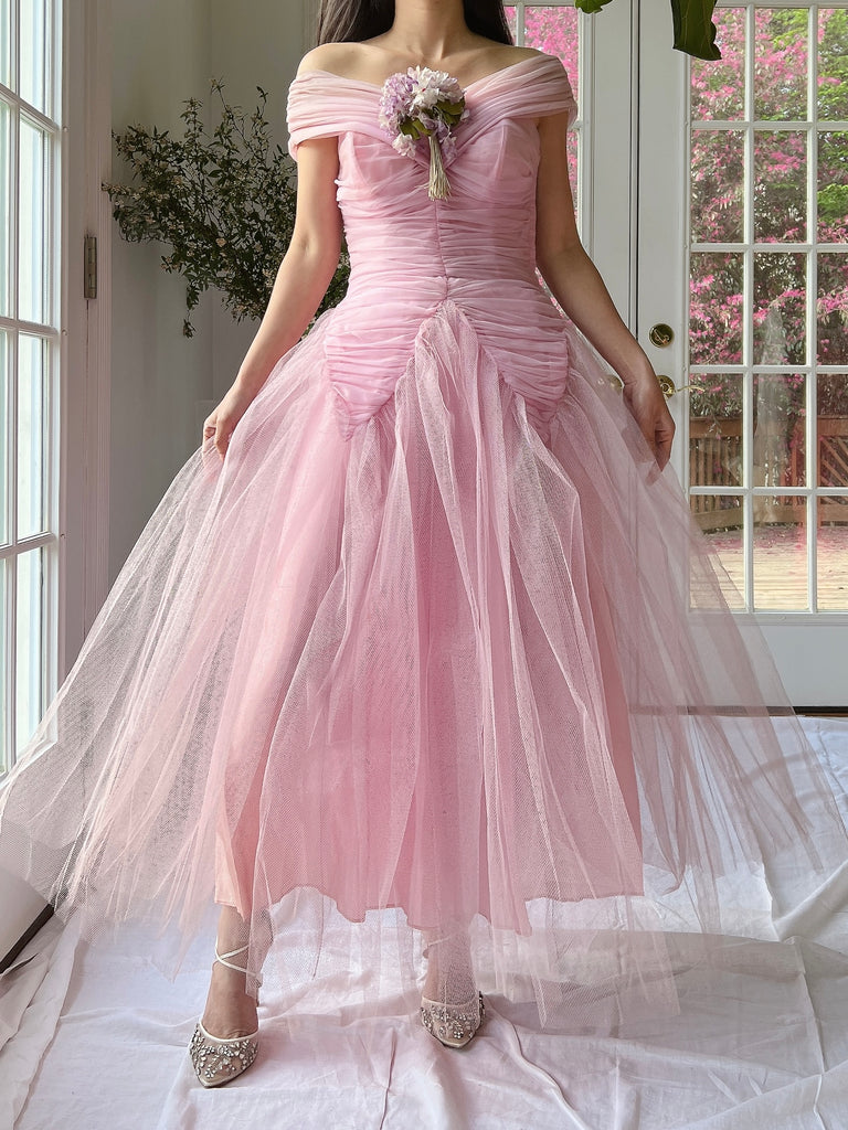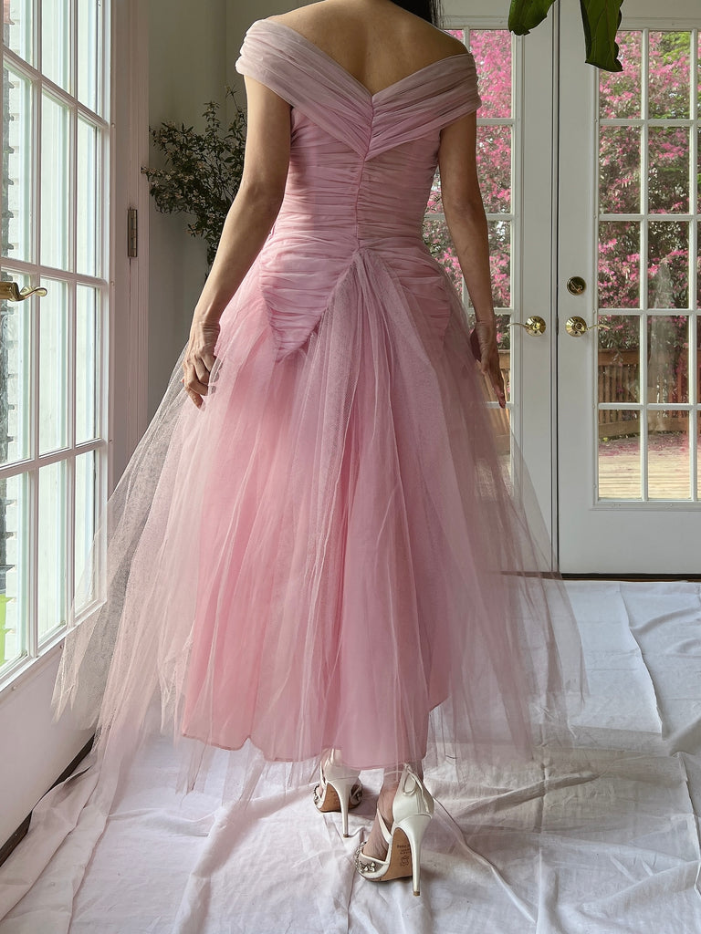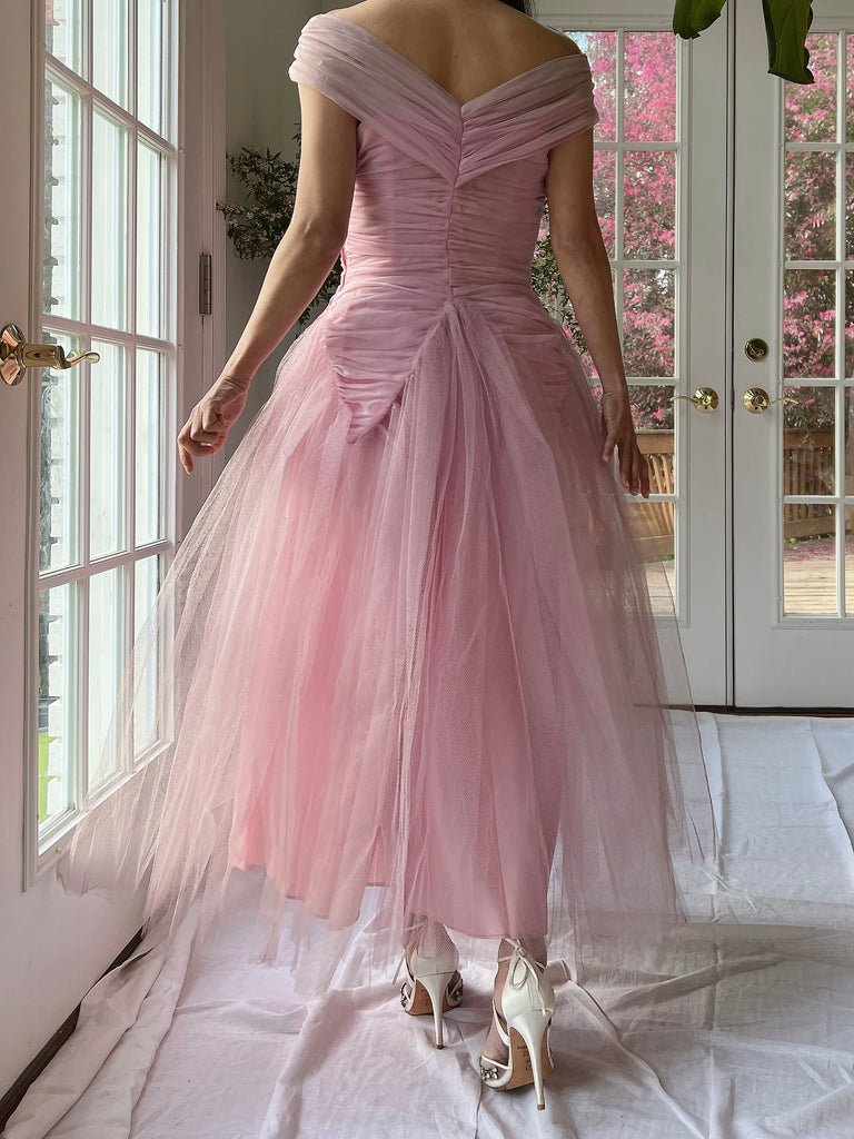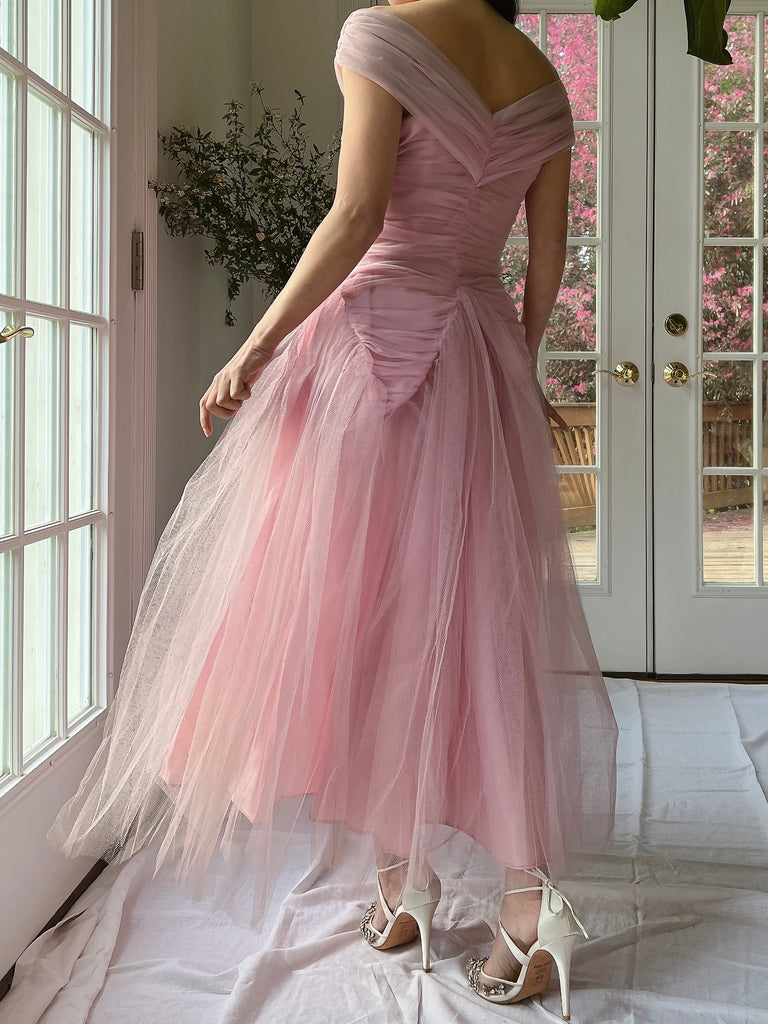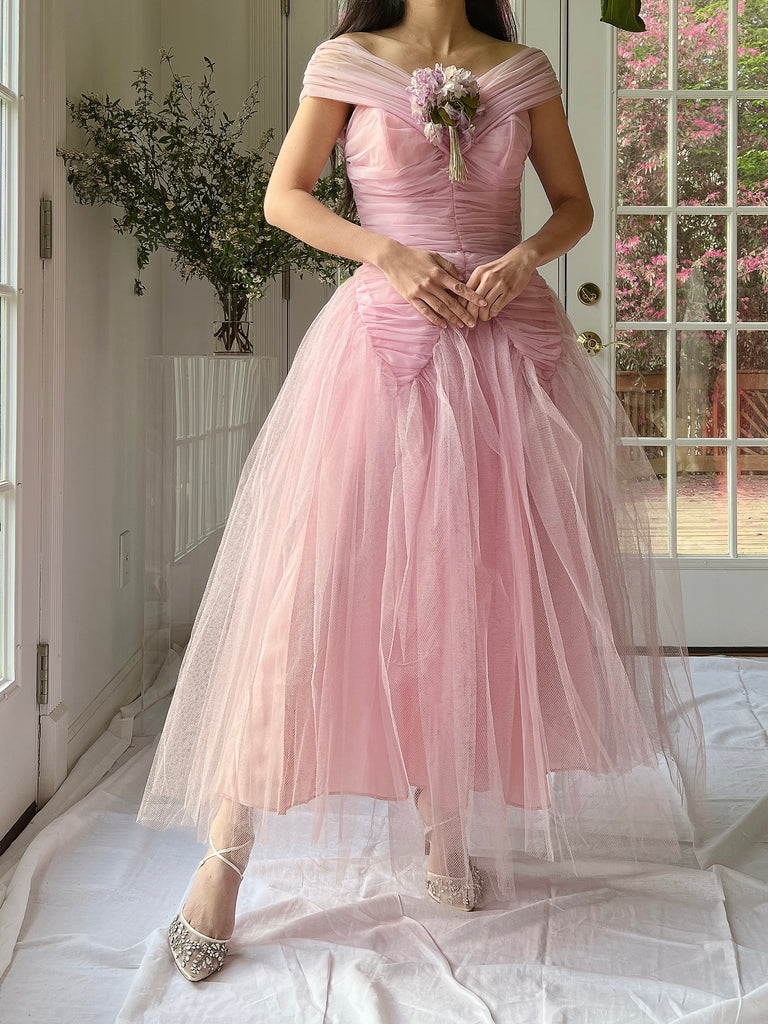 • 1950s Lilac Ruche Dress featuring wide halter collar with full ruche tulle and nylon skirt.