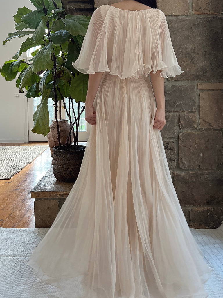 1960s pleated almond colored chiffon gown with cape neckline, and full skirt with back zipper closure.