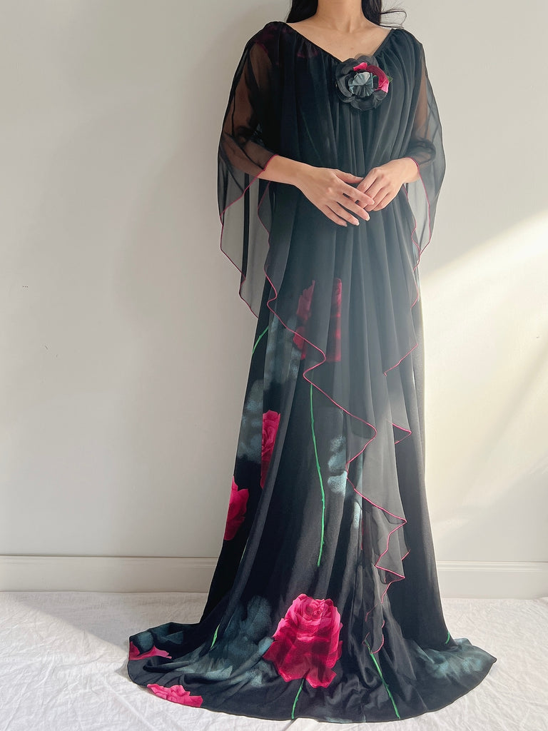 • DESCRIPTION: 1960s gown with cape overlay over printed floral jersey.