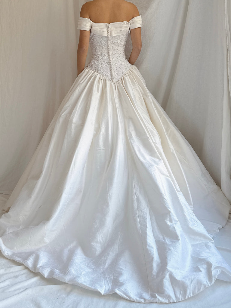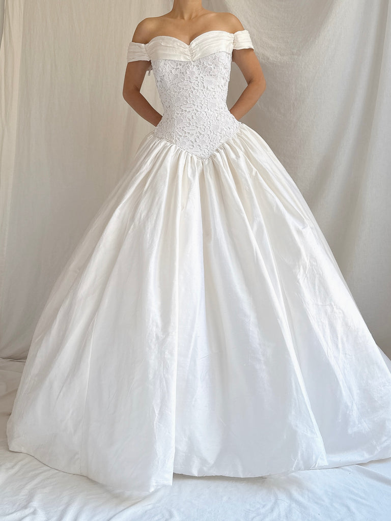 • DESCRIPTION: Vintage Off-the-Shoulder Gown featuring embroidered lace bodice, basque waist and full skirt.