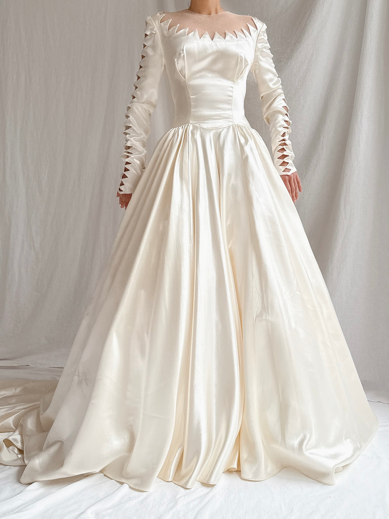 • DESCRIPTION: 1950s Candlelight Satin Gown featuring geometric cutouts and illusion neckline. Side zipper closures.
