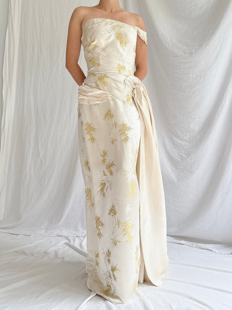 DESCRIPTION: 1960s Silk Brocade Gown featuring sone shoulder straps with side draping.