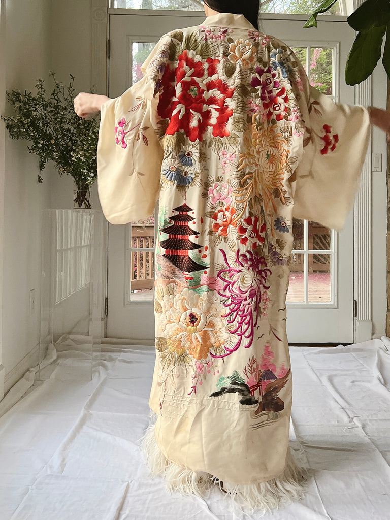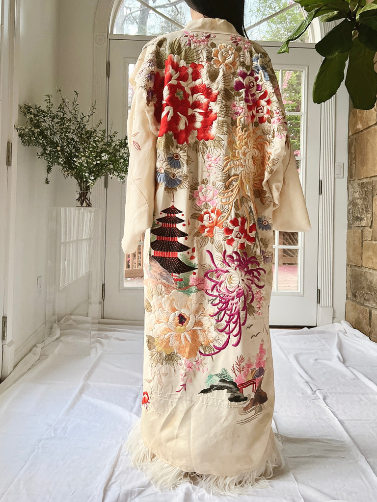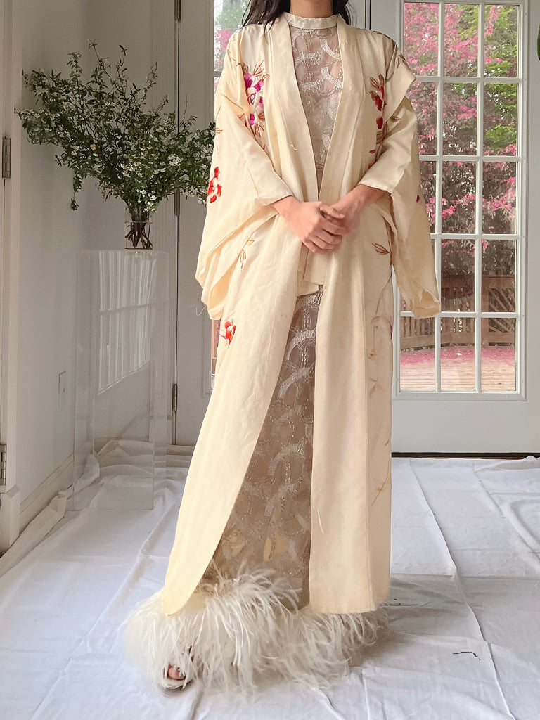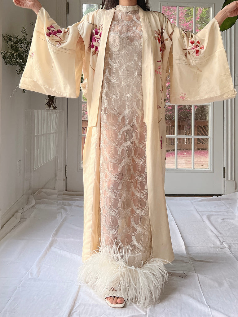 RARE Antique Couched Silk Floral Embroidered Kimono - OSFM