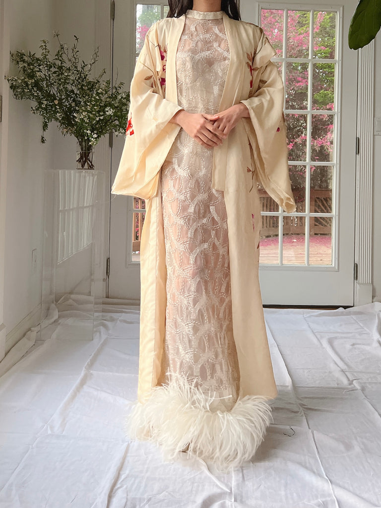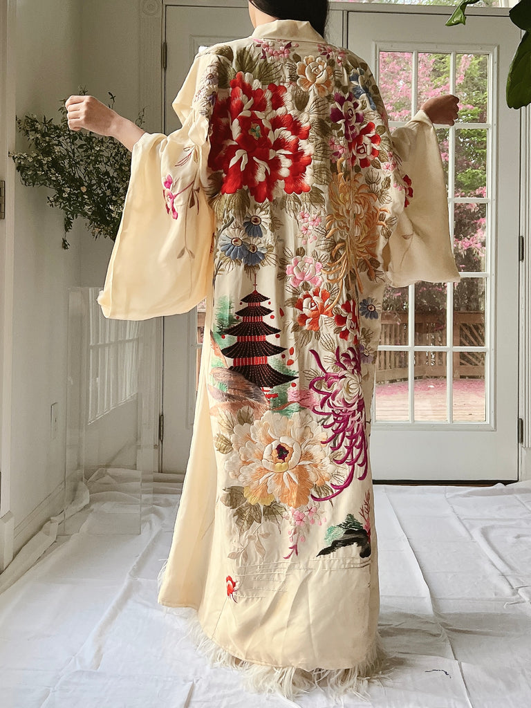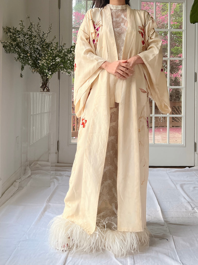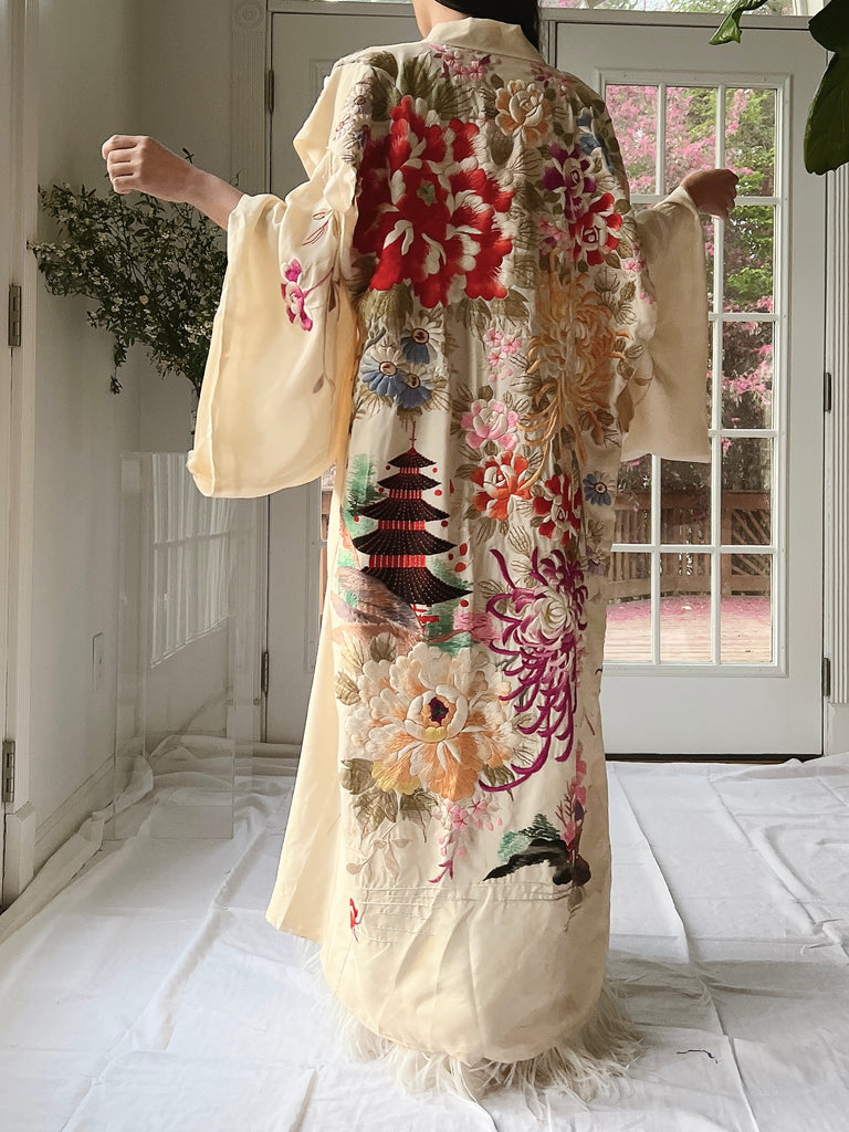 RARE Antique Couched Silk Floral Embroidered Kimono - OSFM