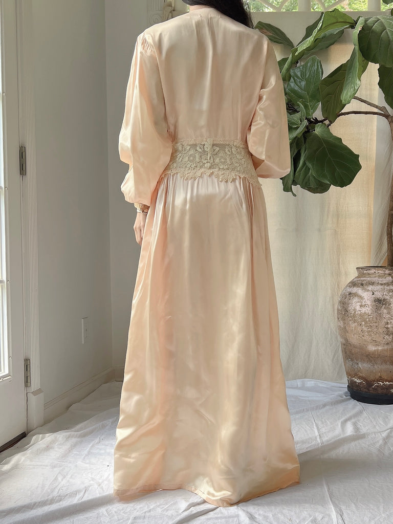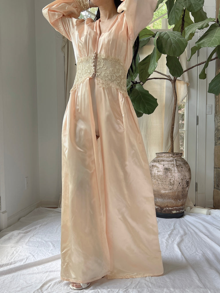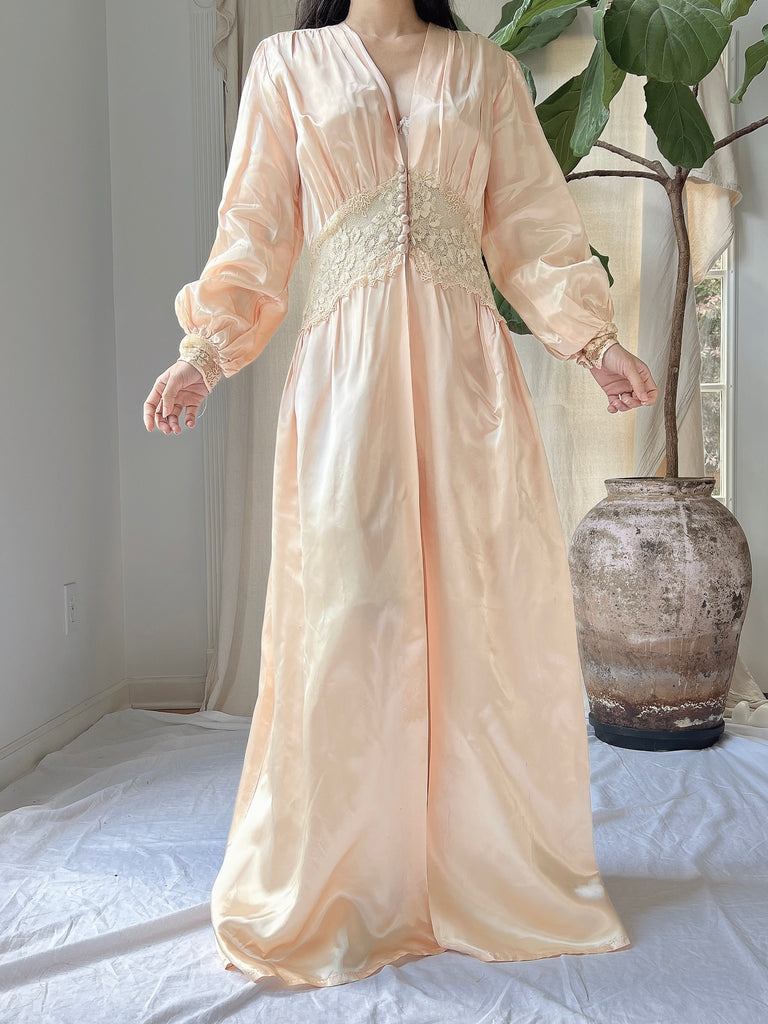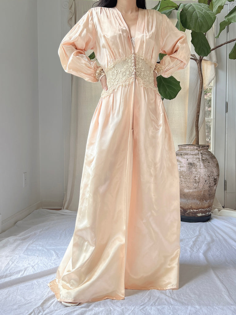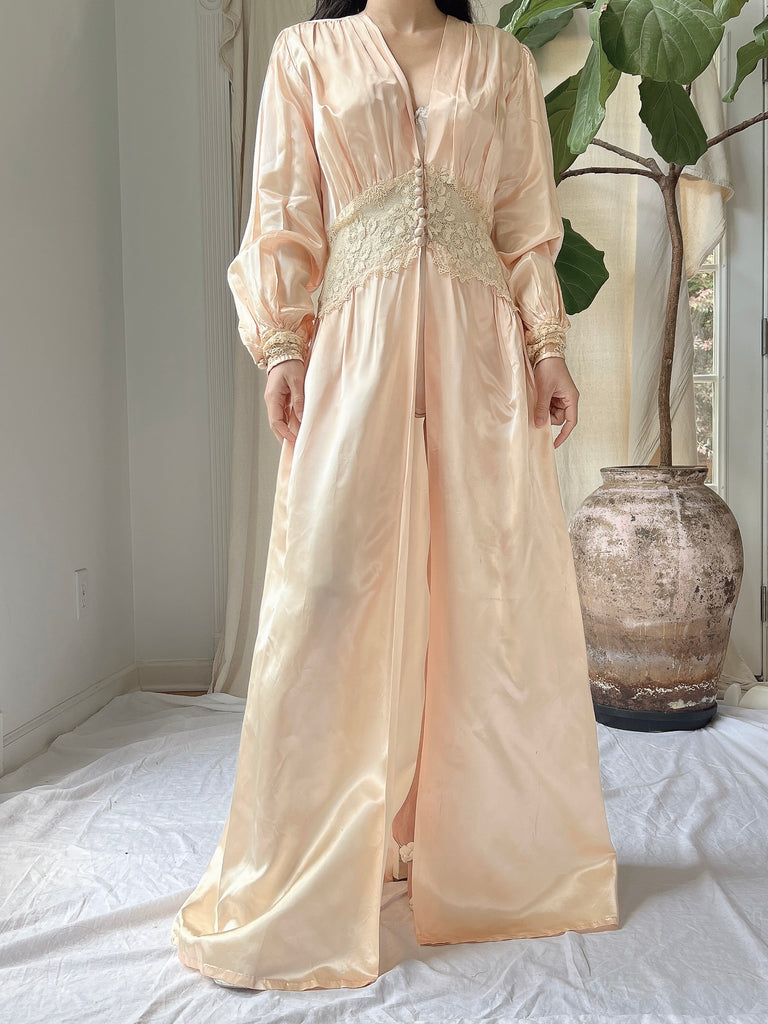 DESCRIPTION: This 1940s dressing gown is crafted from luxurious peach satin, with front closures to ensure a perfect fit. A timeless statement piece, the gown is perfect for special occasions or everyday elegance.